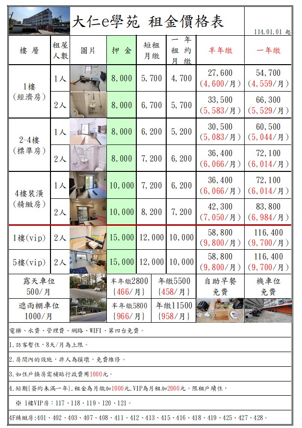 這是我們的租屋價格表,公開透明。或許我們的收費不是最低,但我們服務的品質是最好的。我們隨時檢討並且改善服務品質,給予住戶最佳的居住品質。